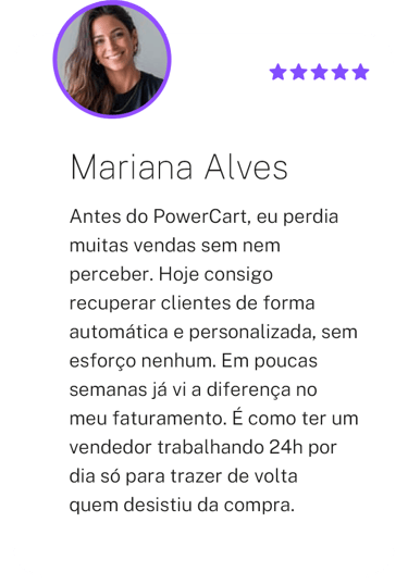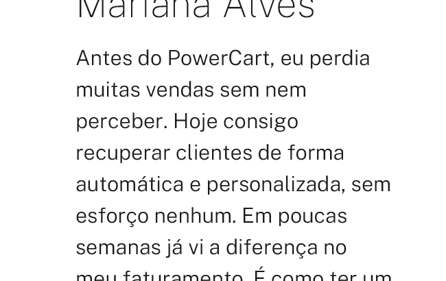 Em vez de parecer insistência, a mensagem vira oportunidade de fechar negócio.O PowerCart permite que você personalize facilmente suas mensagens e recupere mais vendas com a cara da sua marca.